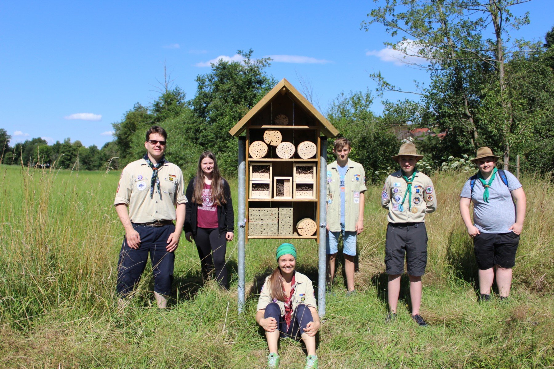 Zelten, das einfache Leben unter freiem Himmel und die Natur mit allen Sinnen genießen – das gehört fest zum Pfadfinden. Doch wir wollen in der DPSG die Natur nicht nur erleben, sondern sie als Schöpfung auch bewahren. Das ist heute, wichtiger als je zuvor. Dazu zählt, dass Kinder und Jugendliche lernen, respektvoll mit unserer Umwelt umzugehen. Gerade, wenn der Trend zu immer mehr Ganztagsbetreuung, Fokus auf das digitale Leben und Entfremdung von der Natur geht. Für uns bedeutet es, in allem, was um uns herum läuft, krabbelt, fliegt, schwimmt, wächst und fließt, in allem, worauf wir gehen und stehen und in der Luft, die wir atmen, einen wertvollen Teil der Natur und der Schöpfung zu sehen – auch in uns selbst! Daraus entstand die Idee die beiden Insektenhotels der Pfadfinder zu bauen.