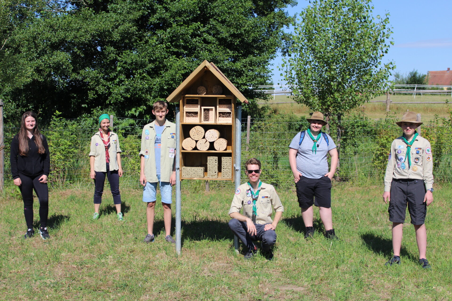 Zelten, das einfache Leben unter freiem Himmel und die Natur mit allen Sinnen genießen – das gehört fest zum Pfadfinden. Doch wir wollen in der DPSG die Natur nicht nur erleben, sondern sie als Schöpfung auch bewahren. Das ist heute, wichtiger als je zuvor. Dazu zählt, dass Kinder und Jugendliche lernen, respektvoll mit unserer Umwelt umzugehen. Gerade, wenn der Trend zu immer mehr Ganztagsbetreuung, Fokus auf das digitale Leben und Entfremdung von der Natur geht. Für uns bedeutet es, in allem, was um uns herum läuft, krabbelt, fliegt, schwimmt, wächst und fließt, in allem, worauf wir gehen und stehen und in der Luft, die wir atmen, einen wertvollen Teil der Natur und der Schöpfung zu sehen – auch in uns selbst! Daraus entstand die Idee die beiden Insektenhotels der Pfadfinder zu bauen.