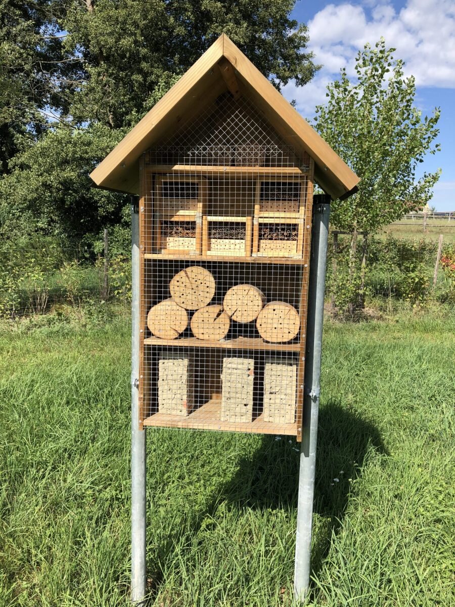 Für den Standort der Insektenhotels sind diverse Faktoren entscheidend. Sonneneinstrahlung, Wasser- und Lehmvorkommen, sowie nahegelegene Futterstellen in Form lange blühender Wiesen. Dafür wird zusätzlich zur bereits vorhandenen Flora nächstes Jahr eine insekten- und bienenfreundliche Blumenwiese gepflanzt. Die Standortwahl waren augenscheinlich gut, denn in den ersten Wochen nach der feierlichen Eröffnung, konnten wir bereits einige Belegung der Zimmer feststellen. Wir werden nun beobachten, welche unsere Brutstätten besonders gut angenommen wird und diese in nächsten Jahr ausbauen.