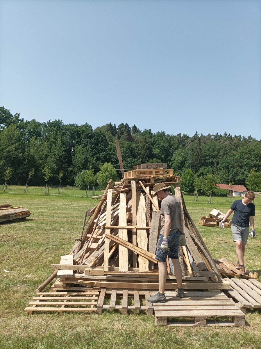Über Wochen haben wir uns überlegt, wo wir von wem wie viel Holz zu welchen Konditionen bekommen können. Wird es genug sein, um einen imposanten Bau zu ermöglichen? Wird es lange genug brennen oder ist nach eineinhalb Stunden der ganze Zauber schon vorbei? Wo lagern wir Getränke und Würstel, die wir unseren Gästen anbieten wollen? An dieser Stelle ganz herzlichen Dank an den EC Schönberg-Wenzenbach e.V., deren Vereinsheim wir zur Lagerung nutzen durften! Die Woche zuvor waren einige von uns Pfadfindern im ganzen Landkreis unterwegs, um von vielen Stellen Holz zu organisieren. Und das musste dann natürlich auch zurück nach Wenzenbach transportiert werden. Schlussendlich hatten wir eine gewaltige Menge Holz zu Verfügung, sodass unsere Sorgen unbegründet waren. Ganz im Gegenteil: Wir konnten gar nicht alles verbauen. Zu aller Sicherheit wollten wir dann noch die uralten Holzbestände aus dem Mesnergarten verwenden. Damit schlugen wir gleich zwei Fliegen mit einer Klappe: Der betreffende Schuppen war danach picobello sauber und wir hatten noch mehr Material für das Sonnwendfeuer. Was wir dort alles fanden, verschlug uns jedoch den Atem. Mehrere Fahrräder, eine alte Eckbank, Gläser, eine Bundeswehrdecke, die Gründungsurkunde der Kolpingsfamilie Wenzenbach aus 1983 und jeder Menge Müll! Diesen haben wir später ordnungsgemäß entsorgt - ein ganzer Autoanhänger voll.