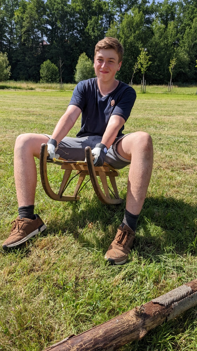 Mit diesen Unmengen an Holz landeten wir dann also auf der Wiese zwischen Sportplatz und Mittelschule und konnten uns austoben. Über Stunden beschäftigten wir uns am Tag des Sonnwendfeuers mit dem Aufschichten all dieser Balken, Schwartlinge und natürlich auch diversen Eckbank-Stücken. Das Highlight allerdings war ein alter Schlitten, der die Spitze unseres Feuers zieren sollte. Daneben war noch unsere Jurte und die Grillstation aufzubauen, mit der wir unsere geladenen Gäste verköstigen wollten. Ach ja und die 400 Bratwürste, Getränke, Semmeln und so weiter haben wir zwischendrin natürlich auch noch eingelagert. (Manchmal frage ich mich, ob man uns auch als Event-Veranstalter anheuern können sollte.)