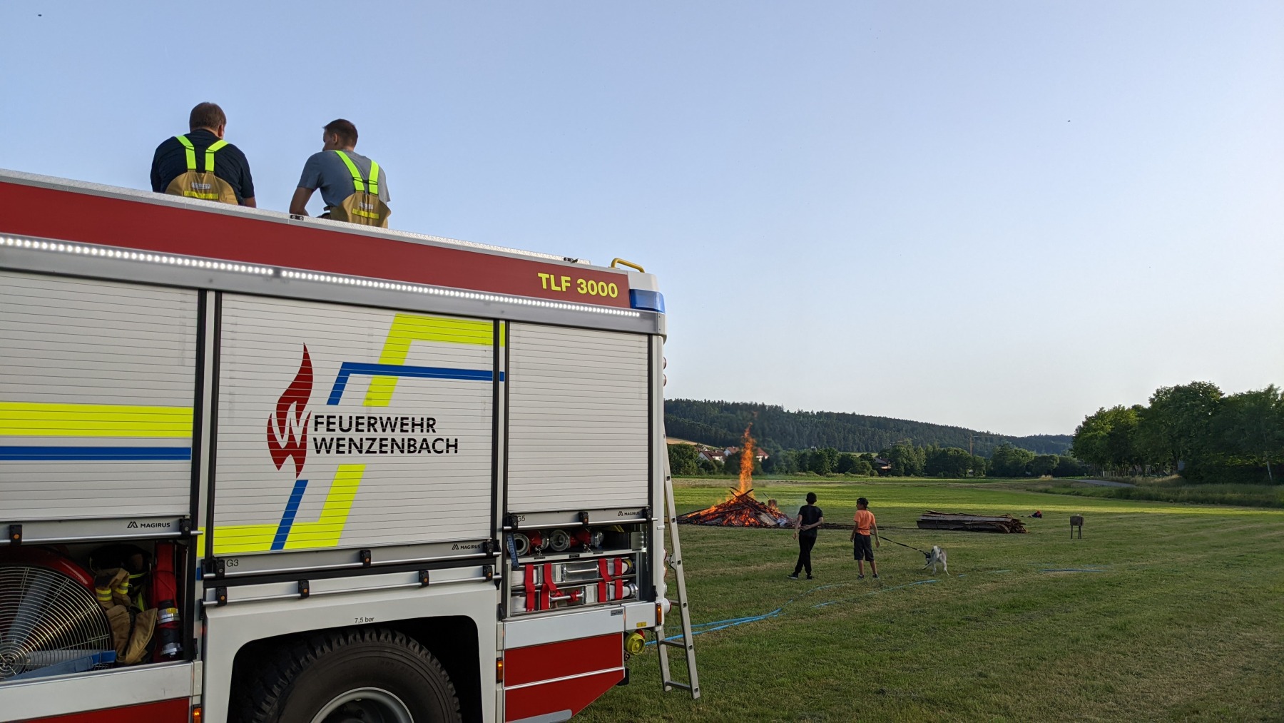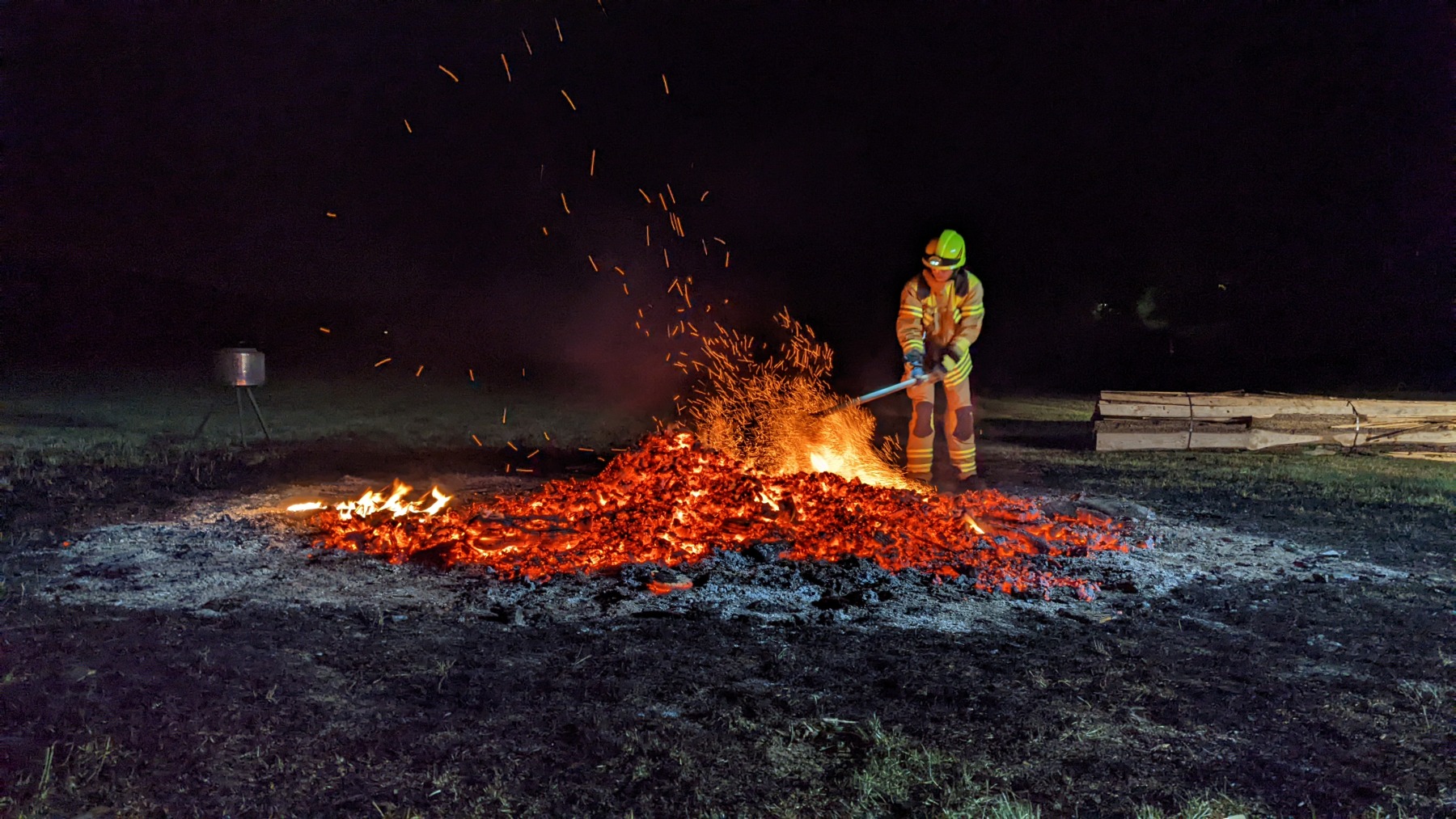 Weit nach Mitternacht rückte dann noch wie vereinbart die Freiwillige Feuerwehr Wenzenbach an, um unseren imposanten Gluthaufen zu löschen. Mit gebanntem Blick beobachteten wir zusammen mit den verbliebenen Gästen die Arbeit der beiden Feuerwehrleute. Obwohl zu Beginn “nur noch” Glut übrig war, dauerte es eine ganze Weile, bis die Feuerwehr ihr OK gab. Wir übernachteten dann nur mit Schlafsäcken direkt auf der Wiese und ließen so den arbeitsreichen, aber erfolgreichen Tag ausklingen.