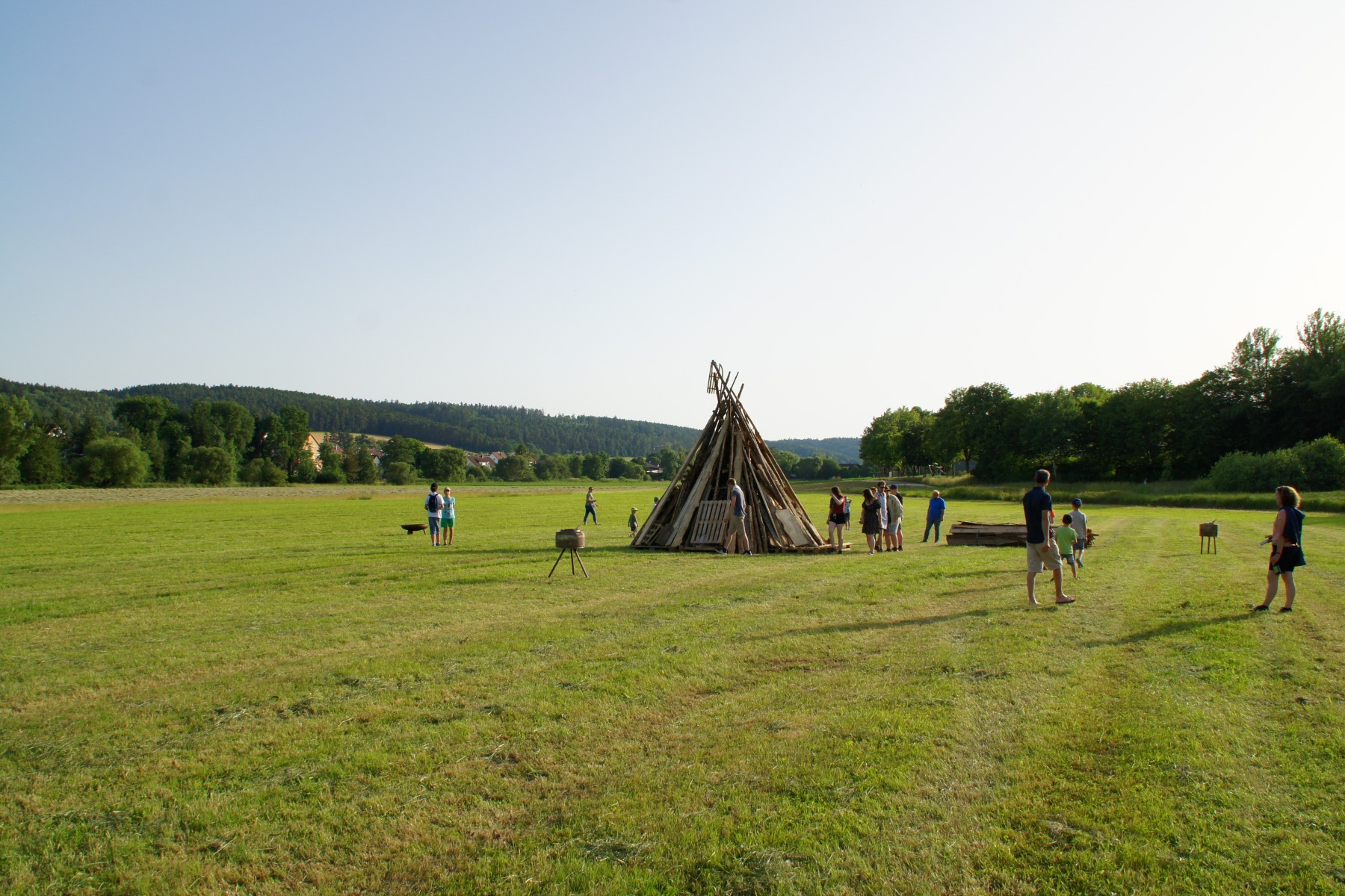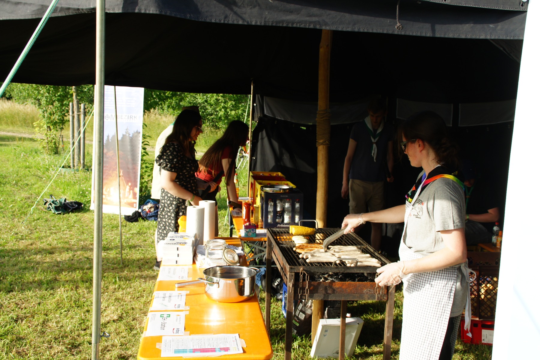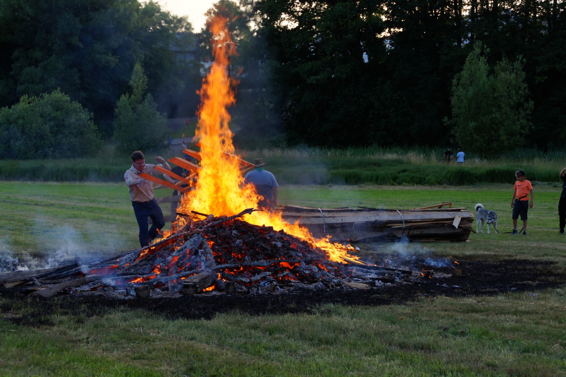 Wenig später lief der Grill und die ersten Gäste hatten ihre Bratwurst- oder Grillkäsesemmeln in den Händen. Worauf wir jetzt alle warten, ist die Dämmerung. Sofern man sie an dem Tag überhaupt so nennen kann. So wirklich dunkler wurde es wenig überraschend nicht. Aber schlussendlich war es so weit und die fünf ältesten Jugendlichen unseres Stammes waren auf dem Weg, um gemeinsam das Sonnwendfeuer zu entzünden. Schließlich hatten sie auch maßgeblich bei der Vorbereitung und dem Aufbau geholfen.