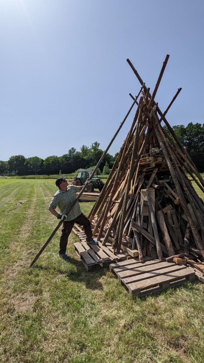 Mit diesen Unmengen an Holz landeten wir dann also auf der Wiese zwischen Sportplatz und Mittelschule und konnten uns austoben. Über Stunden beschäftigten wir uns am Tag des Sonnwendfeuers mit dem Aufschichten all dieser Balken, Schwartlinge und natürlich auch diversen Eckbank-Stücken. Das Highlight allerdings war ein alter Schlitten, der die Spitze unseres Feuers zieren sollte. Daneben war noch unsere Jurte und die Grillstation aufzubauen, mit der wir unsere geladenen Gäste verköstigen wollten. Ach ja und die 400 Bratwürste, Getränke, Semmeln und so weiter haben wir zwischendrin natürlich auch noch eingelagert. (Manchmal frage ich mich, ob man uns auch als Event-Veranstalter anheuern können sollte.)