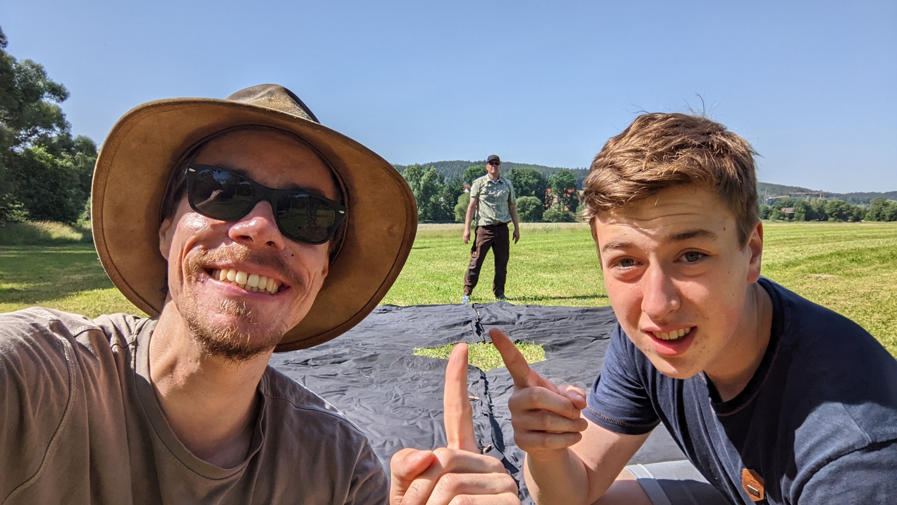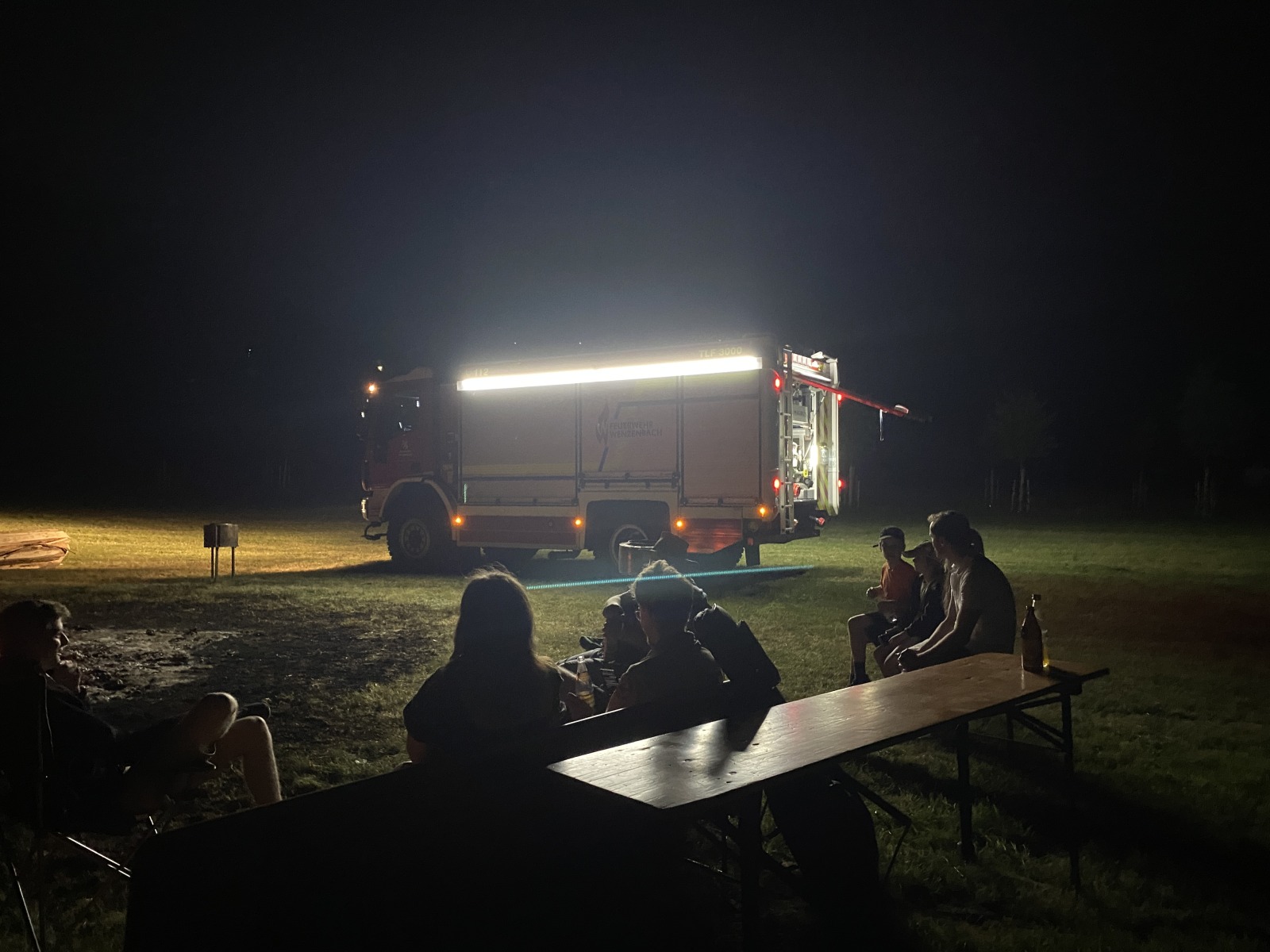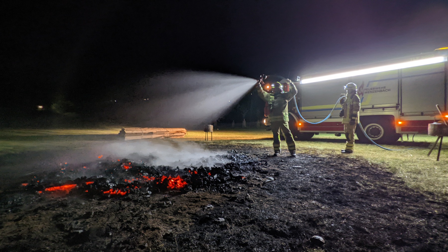 Weit nach Mitternacht rückte dann noch wie vereinbart die Freiwillige Feuerwehr Wenzenbach an, um unseren imposanten Gluthaufen zu löschen. Mit gebanntem Blick beobachteten wir zusammen mit den verbliebenen Gästen die Arbeit der beiden Feuerwehrleute. Obwohl zu Beginn “nur noch” Glut übrig war, dauerte es eine ganze Weile, bis die Feuerwehr ihr OK gab. Wir übernachteten dann nur mit Schlafsäcken direkt auf der Wiese und ließen so den arbeitsreichen, aber erfolgreichen Tag ausklingen.