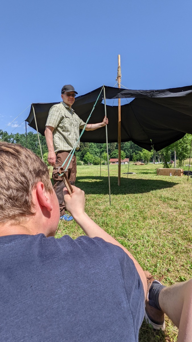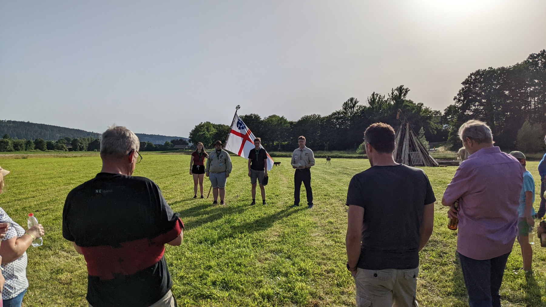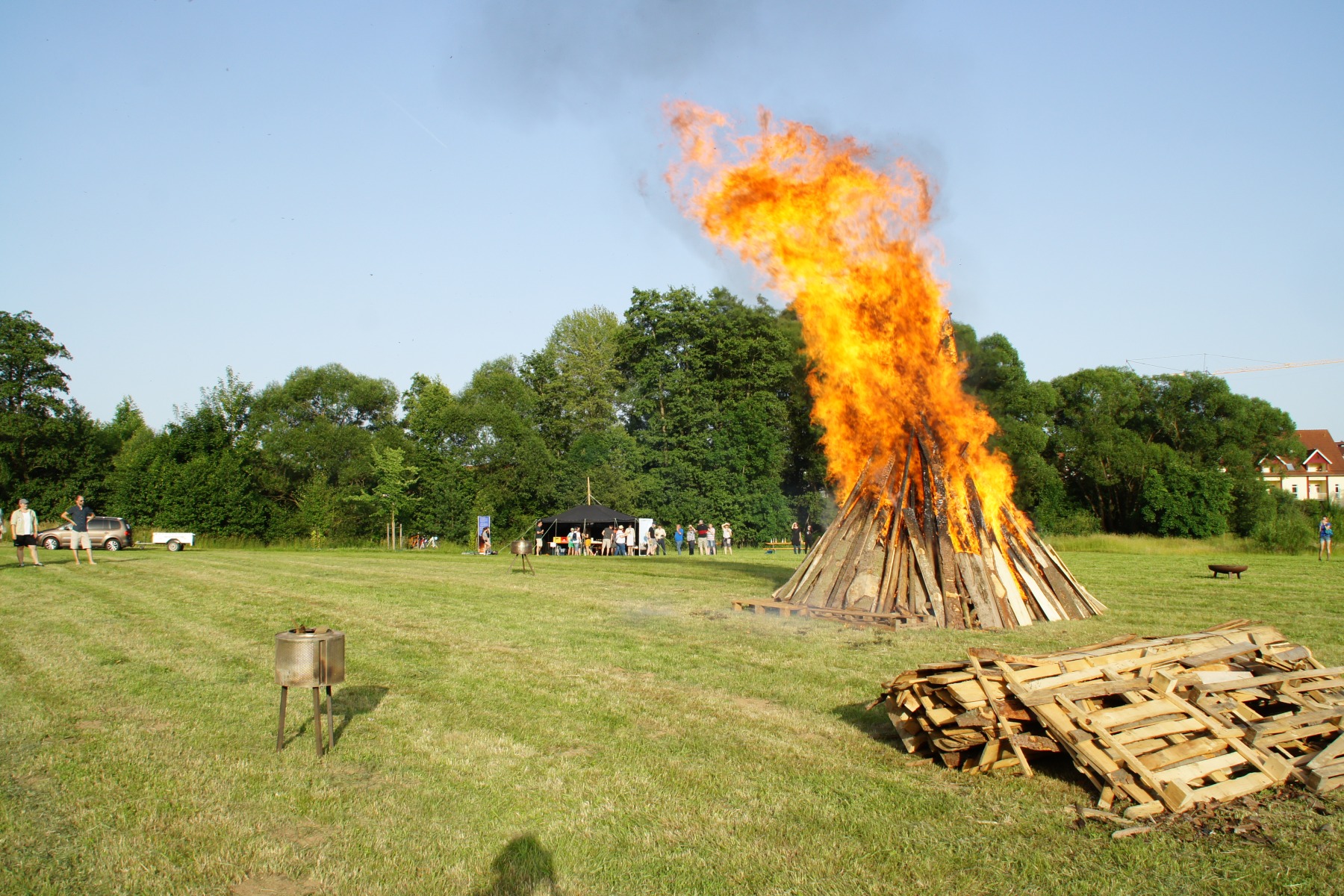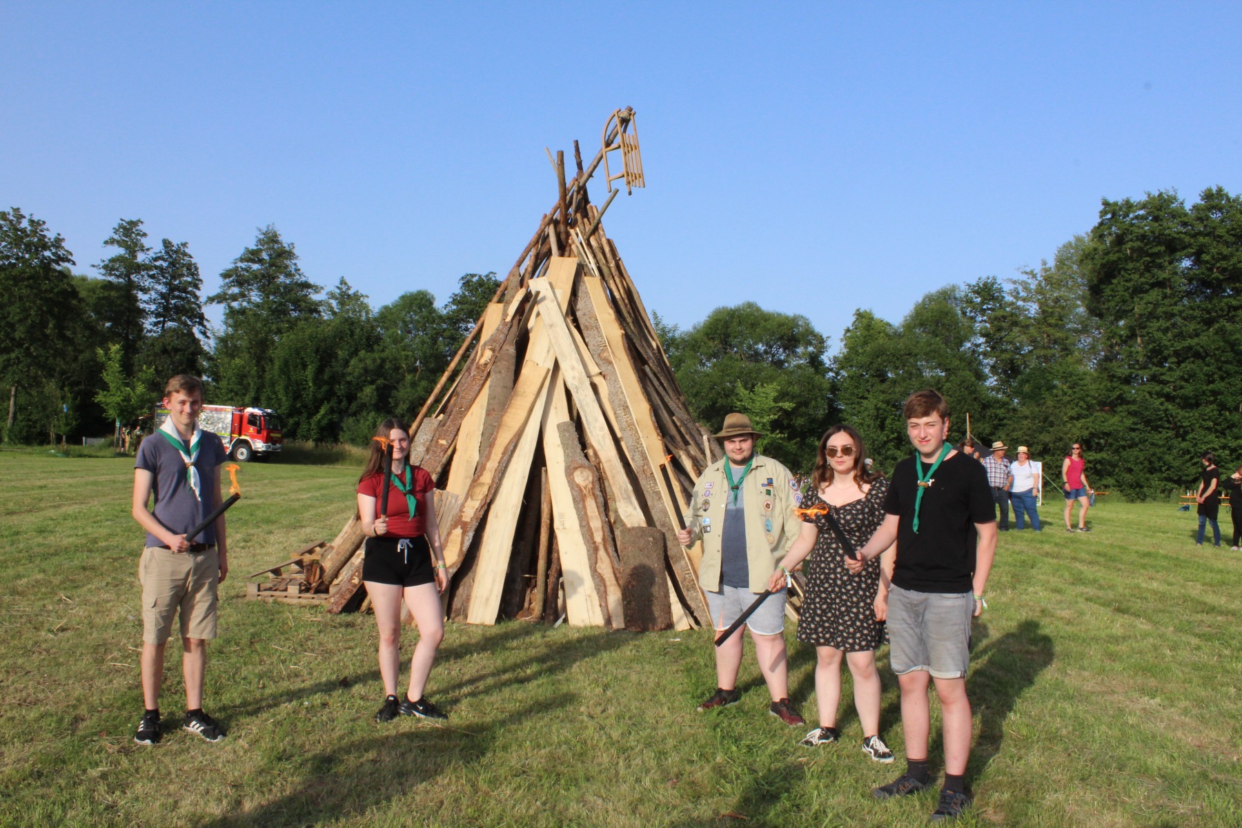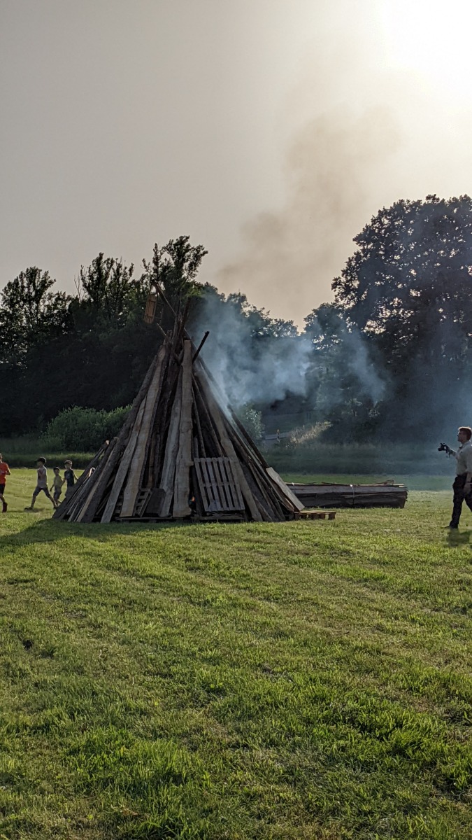 Wenig später lief der Grill und die ersten Gäste hatten ihre Bratwurst- oder Grillkäsesemmeln in den Händen. Worauf wir jetzt alle warten, ist die Dämmerung. Sofern man sie an dem Tag überhaupt so nennen kann. So wirklich dunkler wurde es wenig überraschend nicht. Aber schlussendlich war es so weit und die fünf ältesten Jugendlichen unseres Stammes waren auf dem Weg, um gemeinsam das Sonnwendfeuer zu entzünden. Schließlich hatten sie auch maßgeblich bei der Vorbereitung und dem Aufbau geholfen.