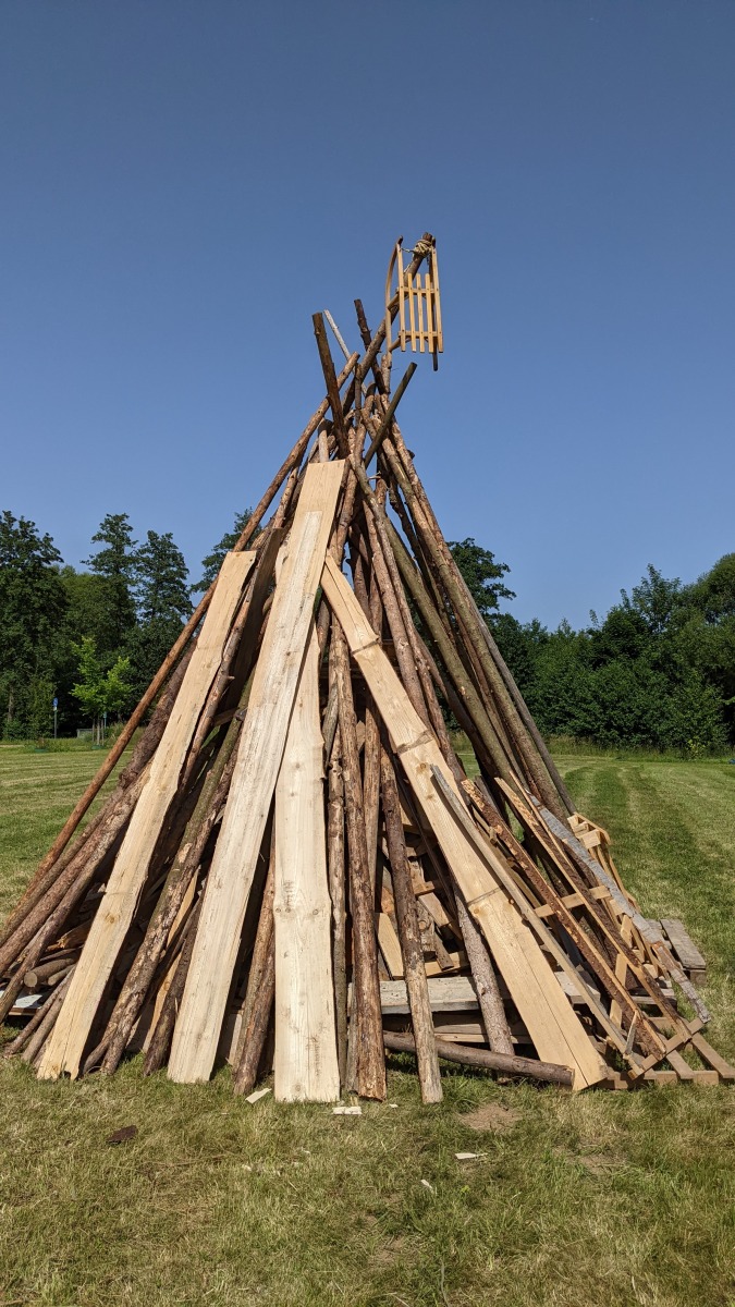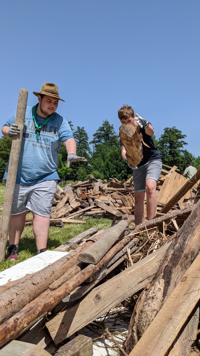 Über Wochen haben wir uns überlegt, wo wir von wem wie viel Holz zu welchen Konditionen bekommen können. Wird es genug sein, um einen imposanten Bau zu ermöglichen? Wird es lange genug brennen oder ist nach eineinhalb Stunden der ganze Zauber schon vorbei? Wo lagern wir Getränke und Würstel, die wir unseren Gästen anbieten wollen? An dieser Stelle ganz herzlichen Dank an den EC Schönberg-Wenzenbach e.V., deren Vereinsheim wir zur Lagerung nutzen durften! Die Woche zuvor waren einige von uns Pfadfindern im ganzen Landkreis unterwegs, um von vielen Stellen Holz zu organisieren. Und das musste dann natürlich auch zurück nach Wenzenbach transportiert werden. Schlussendlich hatten wir eine gewaltige Menge Holz zu Verfügung, sodass unsere Sorgen unbegründet waren. Ganz im Gegenteil: Wir konnten gar nicht alles verbauen. Zu aller Sicherheit wollten wir dann noch die uralten Holzbestände aus dem Mesnergarten verwenden. Damit schlugen wir gleich zwei Fliegen mit einer Klappe: Der betreffende Schuppen war danach picobello sauber und wir hatten noch mehr Material für das Sonnwendfeuer. Was wir dort alles fanden, verschlug uns jedoch den Atem. Mehrere Fahrräder, eine alte Eckbank, Gläser, eine Bundeswehrdecke, die Gründungsurkunde der Kolpingsfamilie Wenzenbach aus 1983 und jeder Menge Müll! Diesen haben wir später ordnungsgemäß entsorgt - ein ganzer Autoanhänger voll.