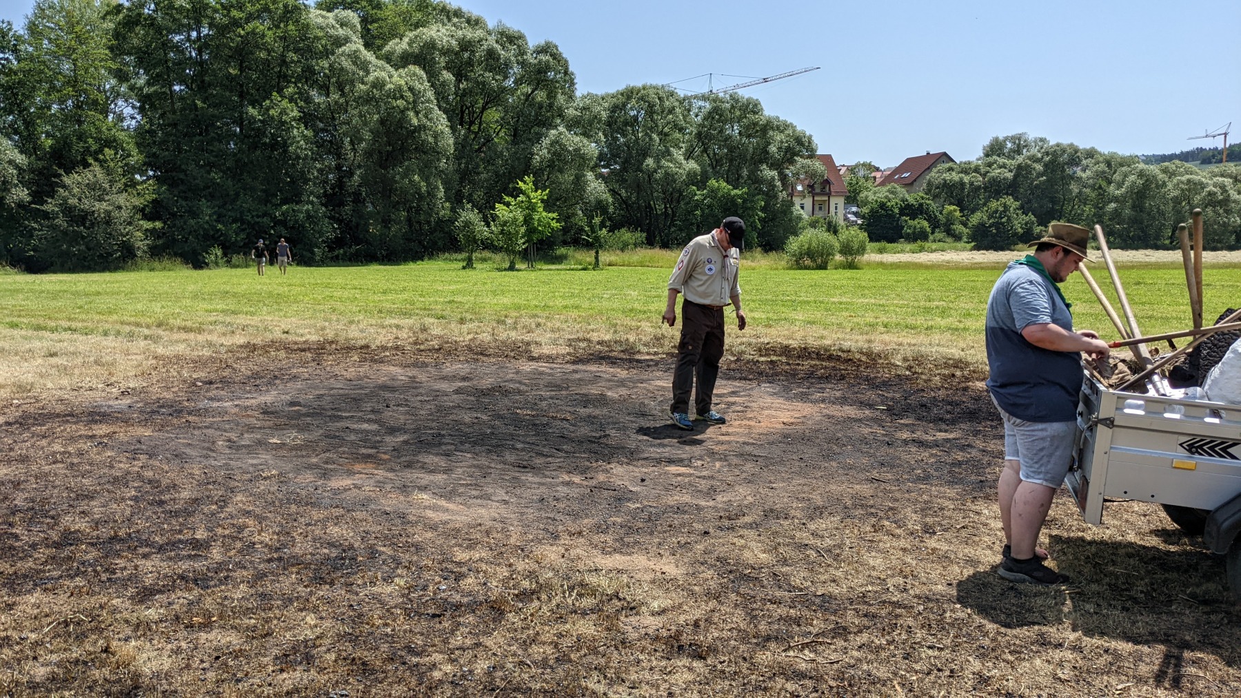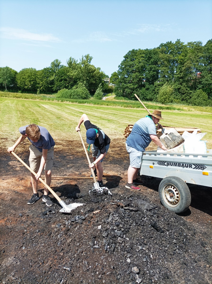 Am nächsten Morgen mussten wir die restliche Asche zusammensammeln und entsorgen - mehrere Kubikmeter waren es zum Schluss. Wir möchten noch einmal allen Helfer:innen, dem Eigentümer und Besitzer der Wiese, dem EC Schönberg-Wenzenbach e.V., der Freiwilligen Feuerwehr Wenzenbach, sowie allen Gästen ganz herzlich danken. Vielleicht findet das Sonnwendfeuer 2023 in einem ähnlichen Rahmen für die Dorfgemeinschaft in Wenzenbach statt.