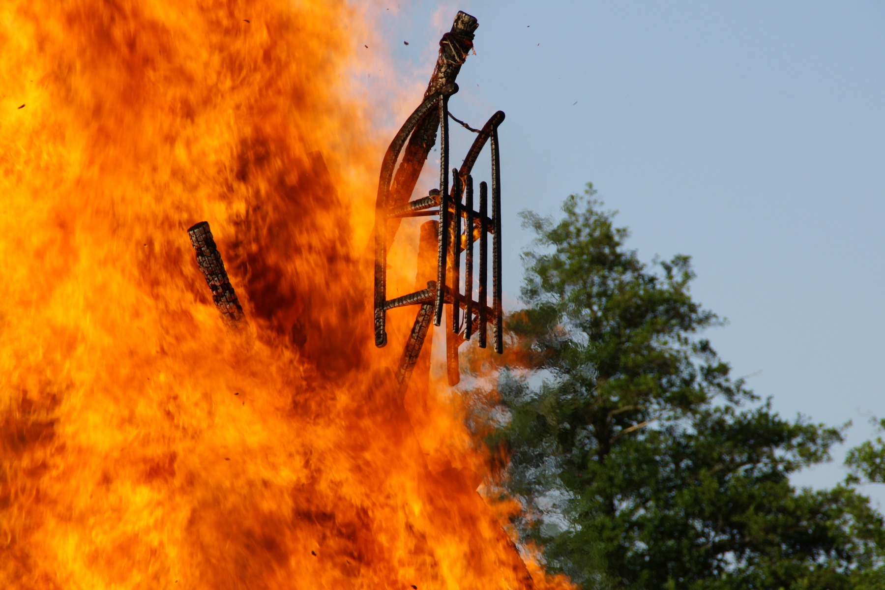 Die Sorge, das Feuer würde nicht oder nur langsam anbrennen, lösten sich wortwörtlich in Rauch auf. Innerhalb kurzer Zeit züngelten orange Flammen aus den Spalten zwischen den äußersten Holzstücken. Und ehe man sich’s versah, war lautes Knistern zu hören. Meterhohe Flammen stießen aus unserem fein säuberlich aufgetragenen Holzstoß - ein voller Erfolg. Langsam wurde es dämmriger, doch der Feuerschein dafür umso imposanter. Ringsum sammelten sich die Gäste und staunten. Faszinierend zu sehen, wie sich automatisch ein Kreis bildete, der offenbar genau das Gleichgewicht zwischen der Neugier der Menschen und der Hitze des Feuers war. Bis in die Nacht brannte unser Sonnwendfeuer und wollte nicht so richtig erlöschen. Selbst der zurückbleibende, große Haufen Glut strahlte so hell, wie ein kleines Lagerfeuer normalerweise brennt. Von der Wärme brauchen wir gar nicht erst zu reden. Was bietet sich hier besser an, als in kleiner Runde noch ein paar Lagerfeuerlieder mit Gitarrenbegleitung zu singen?