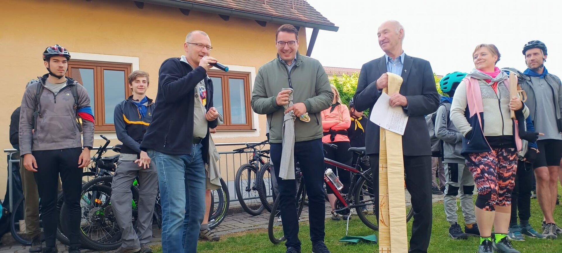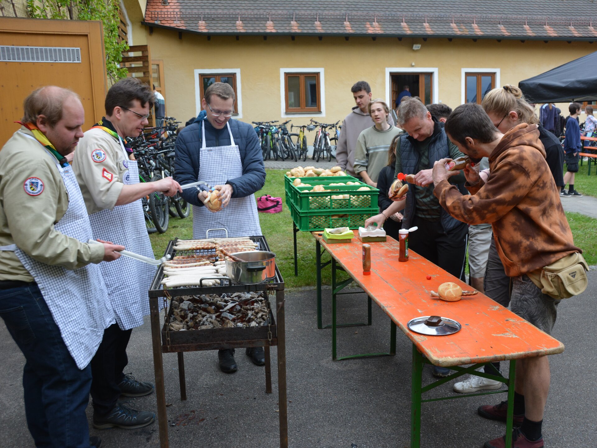 Heuer starteten die deutschen und tschechischen Teilnehmer in Pilsen. Erstmals fuhr auch eine Gruppe Further Ministranten mit. Am Freitag, den 28.04. fuhren die Deutschen mit dem Autobus nach Pilsen. In tschechischen Gastfamilien wurde übernachtet. Am Samstag, den 29.04. nach dem Segen, gings dann los bei gutem, sonnigen Radwetter. Nach einer kurzen Nacht in der Further Turnhalle, Besuch im Drachennest von „Fanny“, dem Further Drachen ging die Tour bis Wenzenbach. Alle 120 Teilnehmer kamen glücklich und erschöpft an. Im Sportverein konnten sich anschließend die Radfahrer duschen. Die Wenzenbacher Pfadfinder versorgten alle mit Getränken und Bratwürstln vom Grill.